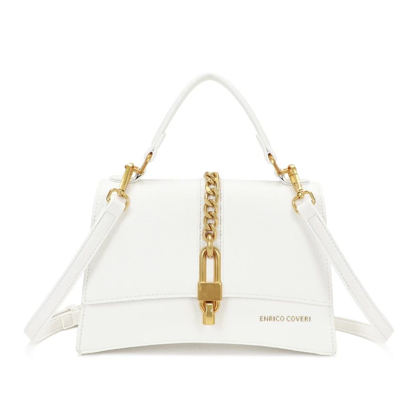 Η τσάντα έχει χρυσή μεταλλική αλυσίδα στο μπροστινό μέρος και αποσπώμενο, ρυθμιζόμενο λουράκι, για να τη φοράς όπως σου αρέσει: στον ώμο ή χιαστί. Το μοντέρνο κούμπωμα και η καθαρή λευκή απόχρωση την κάνουν ιδανική επιλογή για ένα casual chic look ή για ένα βραδινό outfit.