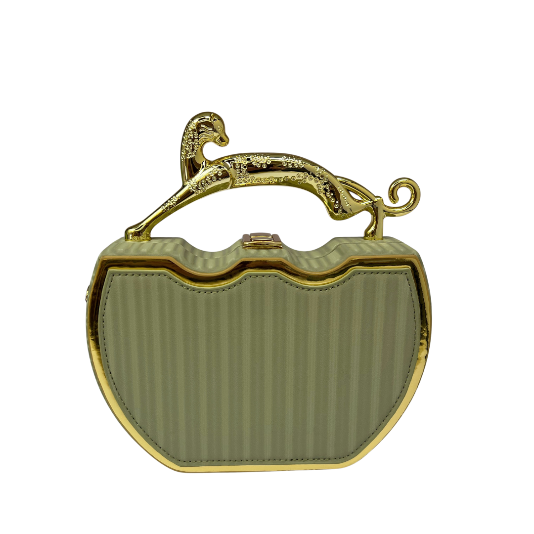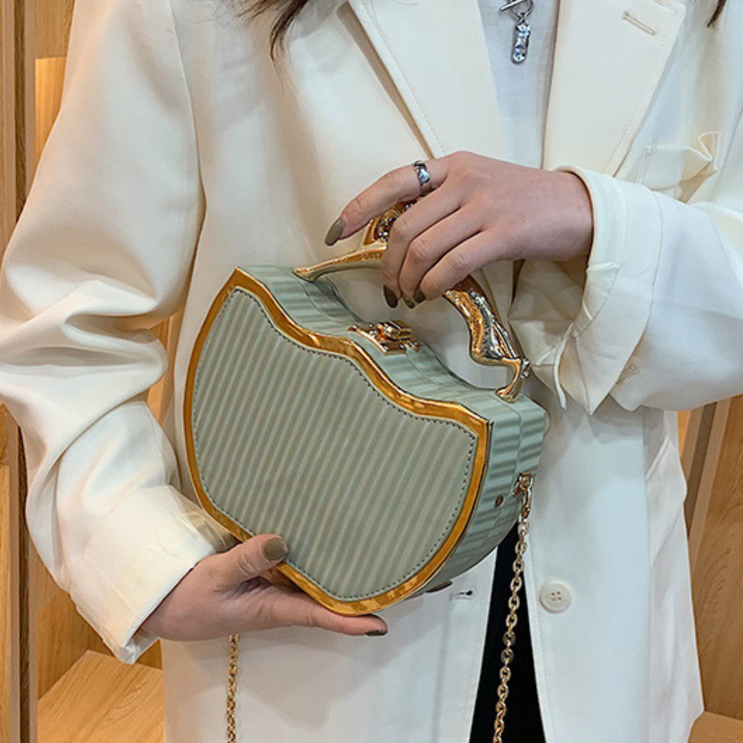 Γυναικεία Τσάντα σε σχήμα Box Ριγέ με Χρυσές Λεπτομέρειες. Γυναικεία ιδιαίτερη τσάντα σε πράσινο χρώμα με ρίγες και χρυσό χερούλι. Τσάντα χειρός και ώμου με εσωτερική αλυσίδα.