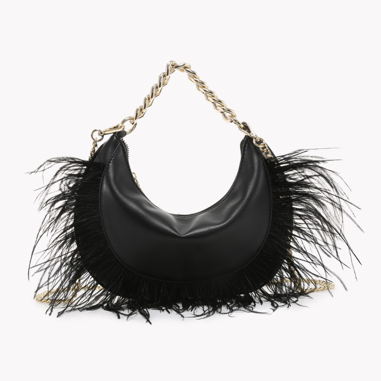 Γυναικεία τσάντα ημισέληνος με φτερά και χρυσή αλυσίδα. Βραδινό τσαντάκι ώμου ημισέληνος σε μαύρο χρώμα.