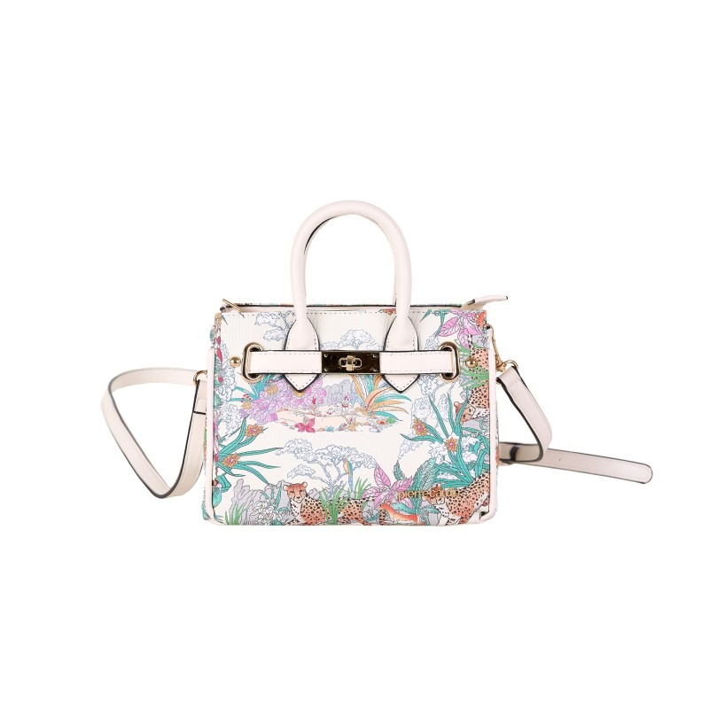 Μια τσάντα που κλέβει την παράσταση! Ένα κομψό mini tote τσαντάκι από οικολογικό δέρμα, διακοσμημένο με ένα εντυπωσιακό τροπικό print που ισορροπεί ανάμεσα στην πολυτέλεια και την παιχνιδιάρικη διάθεση. Οι λευκές βάσεις και τα χρυσά μεταλλικά στοιχεία προσθέτουν φινέτσα, ενώ η ιδιαίτερη μπάρα στο μπροστινό μέρος της χαρίζει στιλ και άποψη.