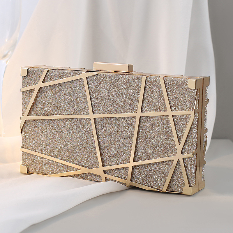 Γυναικείο βραδινό τσαντάκι με εσωτερική αλυσίδα. Λαμπερό τσαντάκι με μεταλλικές λεπτομέρειες σε γεωμετρικό σχήμα. Σατέν επένδυση με clutch κούμπωμα.