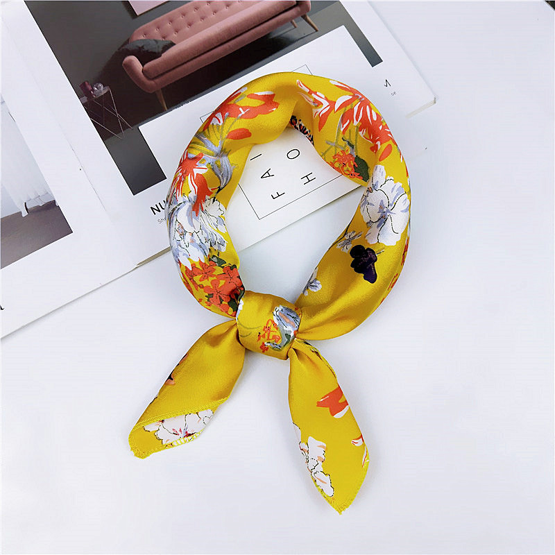 Γυναικείο μεταξωτό μαντήλι floral σε κίτρινο χρώμα, με πορτοκαλί και λευκές λεπτομέρειες λουλούδια. Μαντήλι για το λαιμό, την τσάντα και τα μαλλιά.