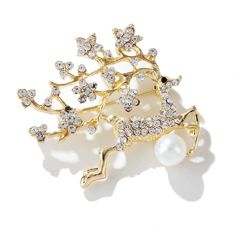 Γυναικεία καρφίτσα ελάφι με στρας και πέρλα σε χρυσό χρώμα.
