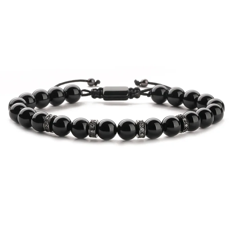 Ανδρικό βραχιόλι Tiger Eye με φυσικές χάντρες και zircon σε μαύρο χρώμα.