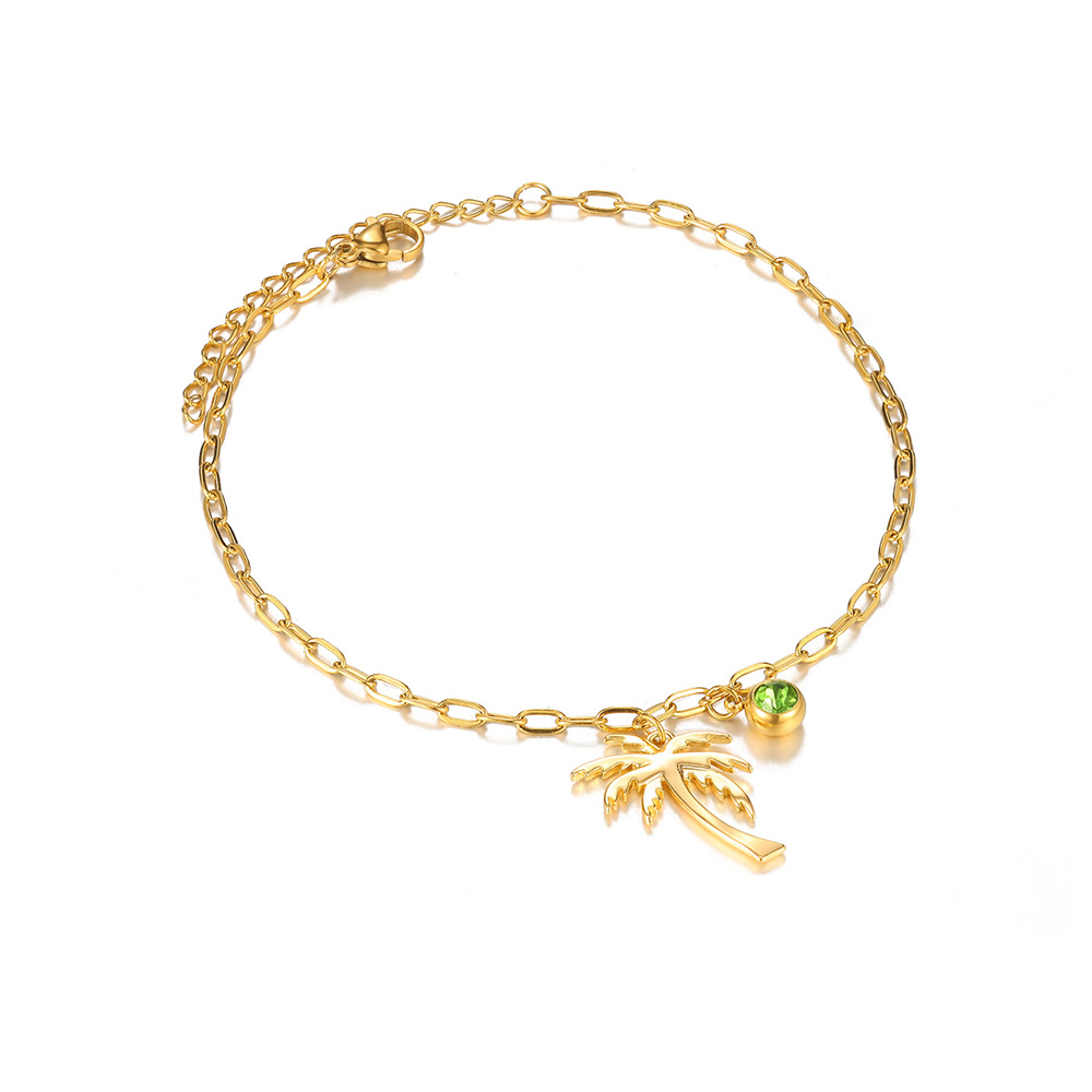 Γυναικεία διπλή αλυσίδα ποδιού Palm από ανοξείδωτο ατσάλι επιχρυσωμένη 18K με πράσινο zircon και διακοσμητικό φοίνικα.