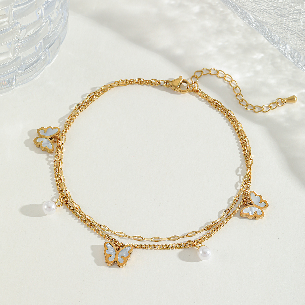 Γυναικεία αλυσίδα ποδιού White Butterfly από ανοξείδωτο ατσάλι επιχρυσωμένη 18K με πέρλες και διακοσμητικές πεταλούδες.