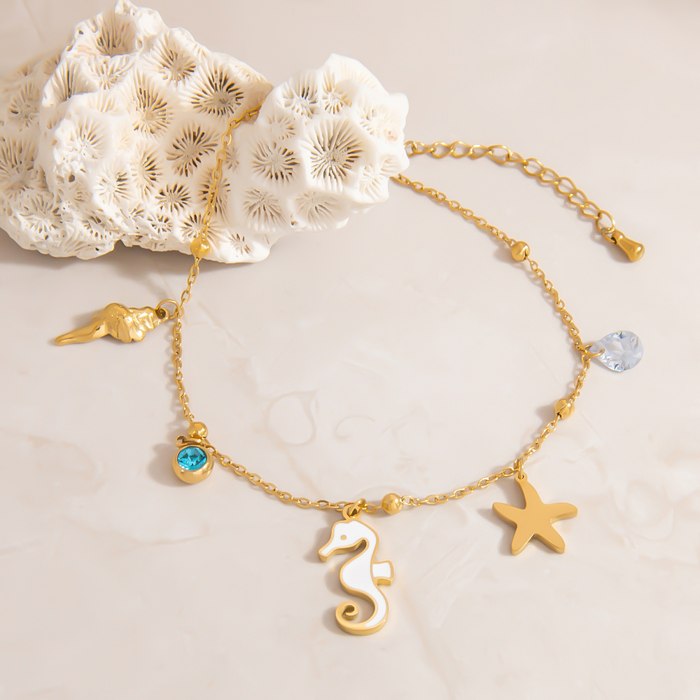 Γυναικεία αλυσίδα ποδιού White Hippocampus από ανοξείδωτο ατσάλι επιχρυσωμένη 18K με zircon και λευκό ιππόκαμπο.