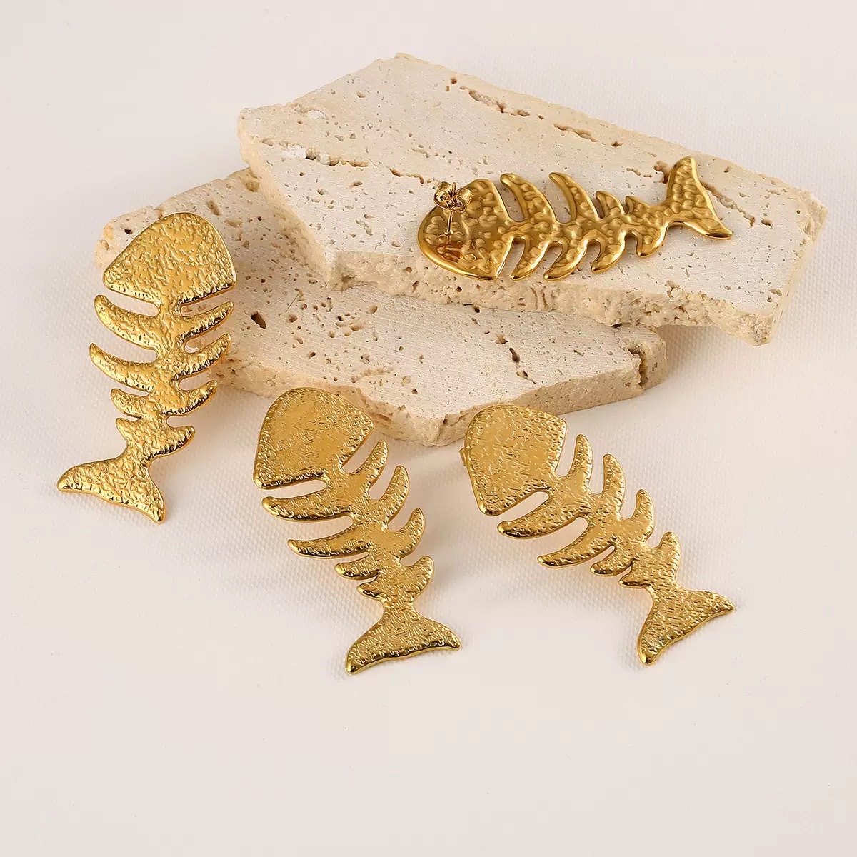 Γυναικεία μεγάλα σκουλαρίκια Gold Fishbone από ανοξείδωτο ατσάλι επιχρυσωμένα 18Κ. Ιδιαίτερα statement κρεμαστά σκουλαρίκια ψαροκόκαλο.