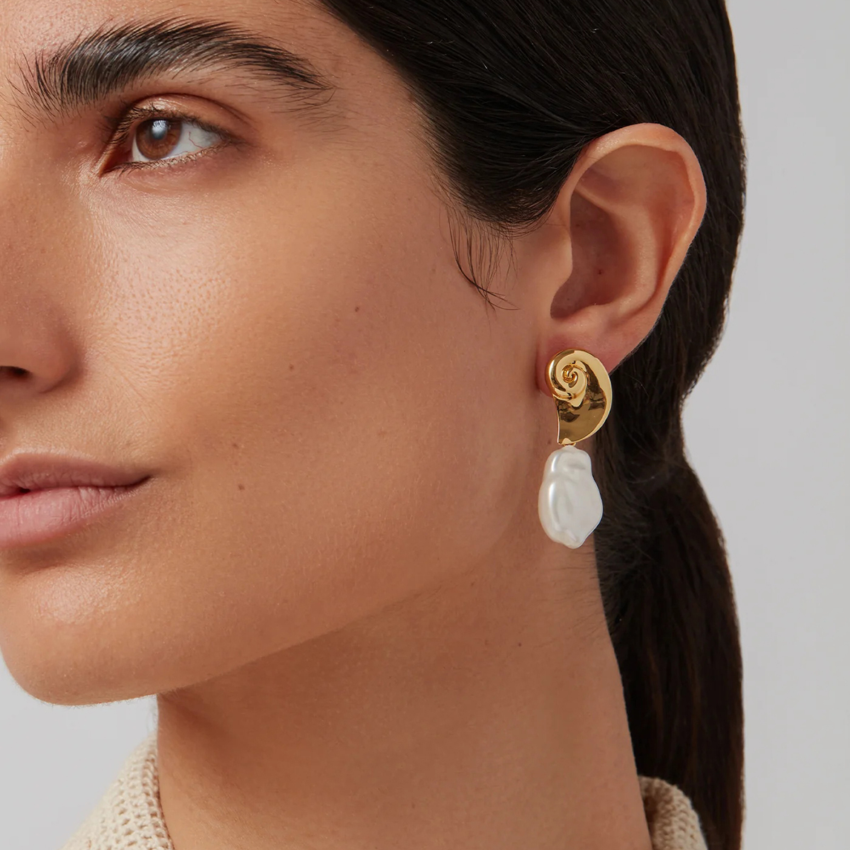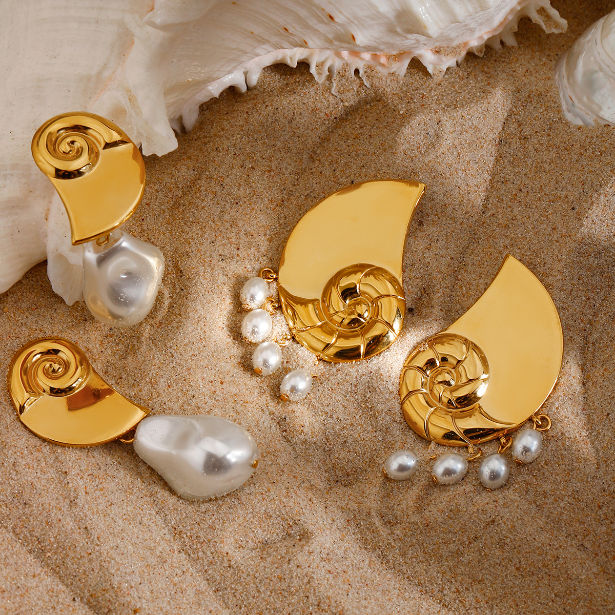 Γυναικεία σκουλαρίκια spiral κοχύλι από ανοξείδωτο ατσάλι με πέρλες σε δύο καλοκαιρινά σχέδια.