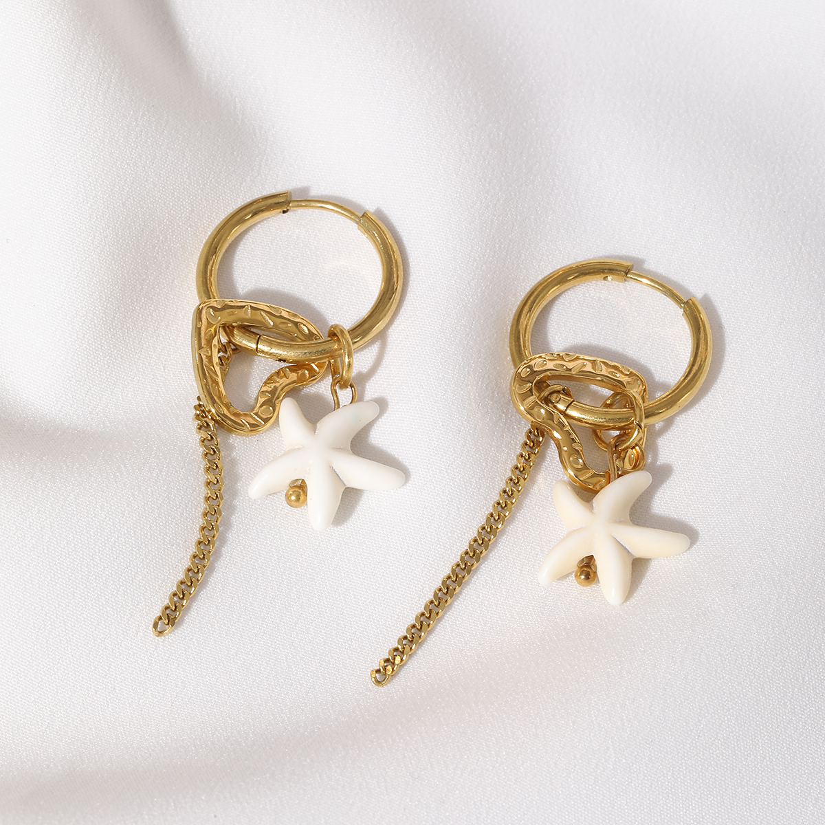 Γυναικεία σκουλαρίκια κρίκοι White Starfish Καρδιά από ανοξείδωτο ατσάλι επιχρυσωμένα 18Κ. Καλοκαιρινά σκουλαρίκια λευκός αστερίας, κρίκοι με καρδία.