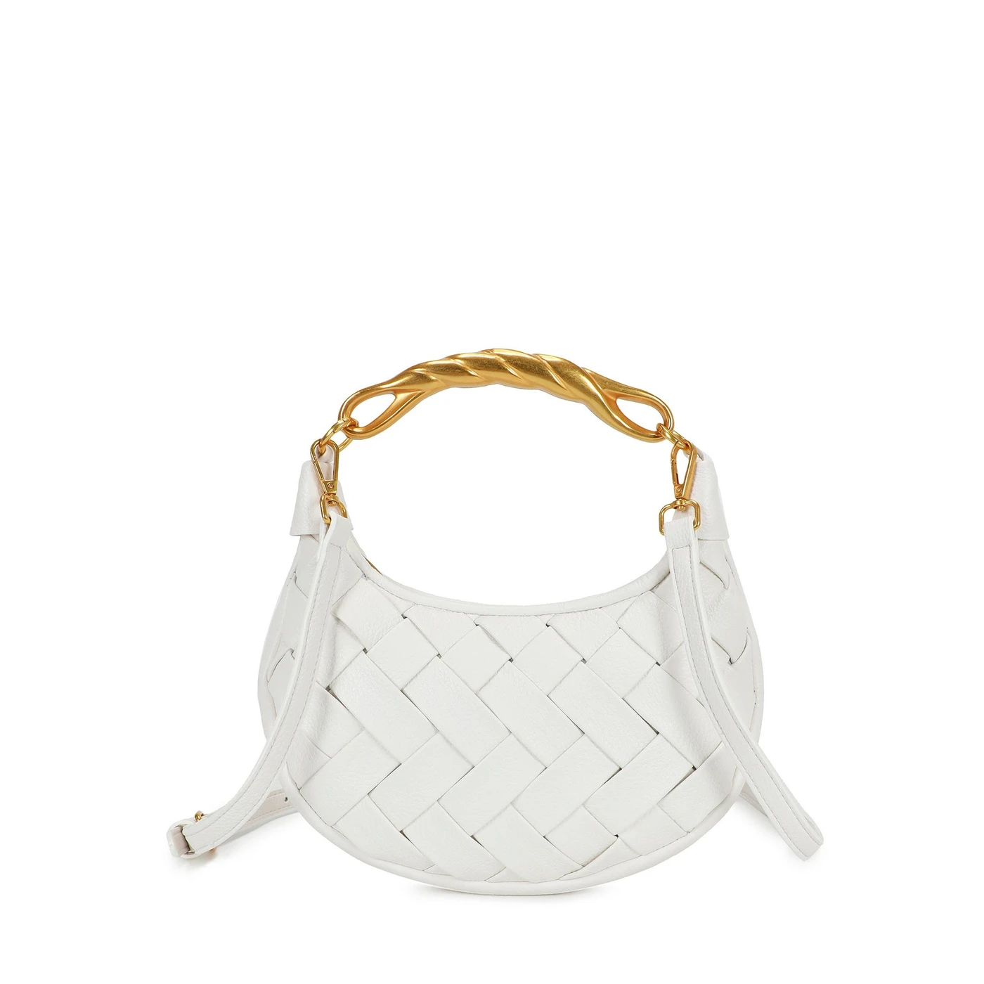 Γυναικεία τσάντα χειρός λευκή πλέξη με Twisted χρυσό χερούλι και αποσπώμενο λουράκι.