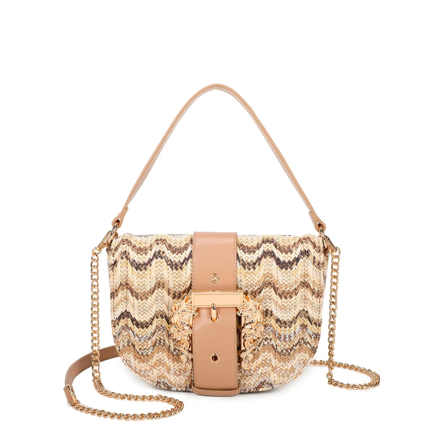 Γυναικεία ψάθινη τσάντα Raffia σε μπεζ χρώμα με χρυσή αλυσίδα και διακοσμητική αγκράφα. Εξαιρετικά ευέλικτη και εντυπωσιακή τσάντα, διαθέτει αρκετό χώρο για τα απαραίτητα του καλοκαιριού και συνδυάζεται εύκολα με κάθε outfit. Από casual καθημερινές εμφανίσεις μέχρι πιο επίσημες βραδινές περιστάσεις.