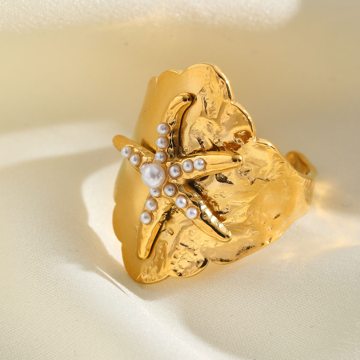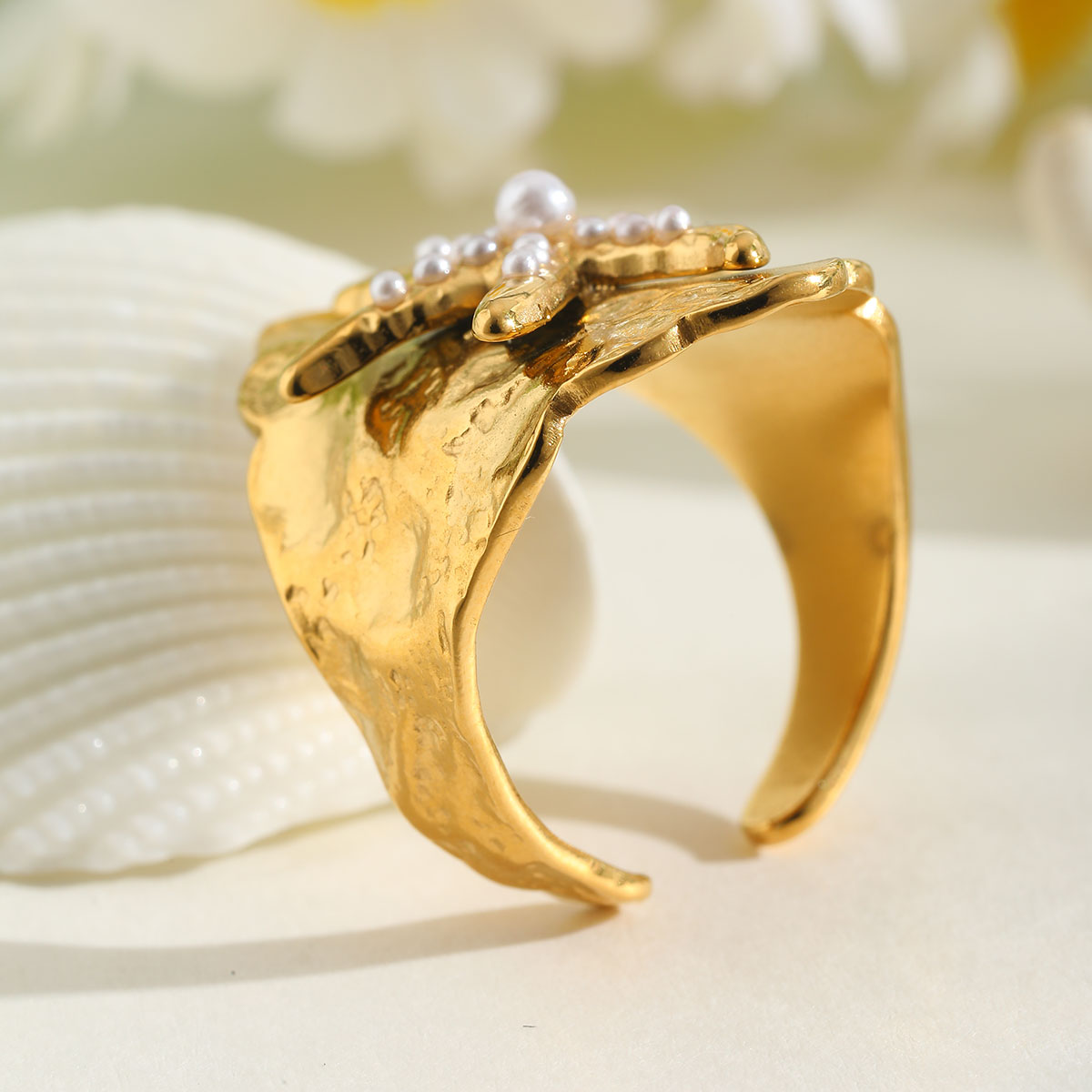 Γυναικείο δαχτυλίδι Αστερίας με πέρλες από ανοξείδωτο ατσάλι επιχρυσωμένο 18Κ ανοιχτού τύπου.