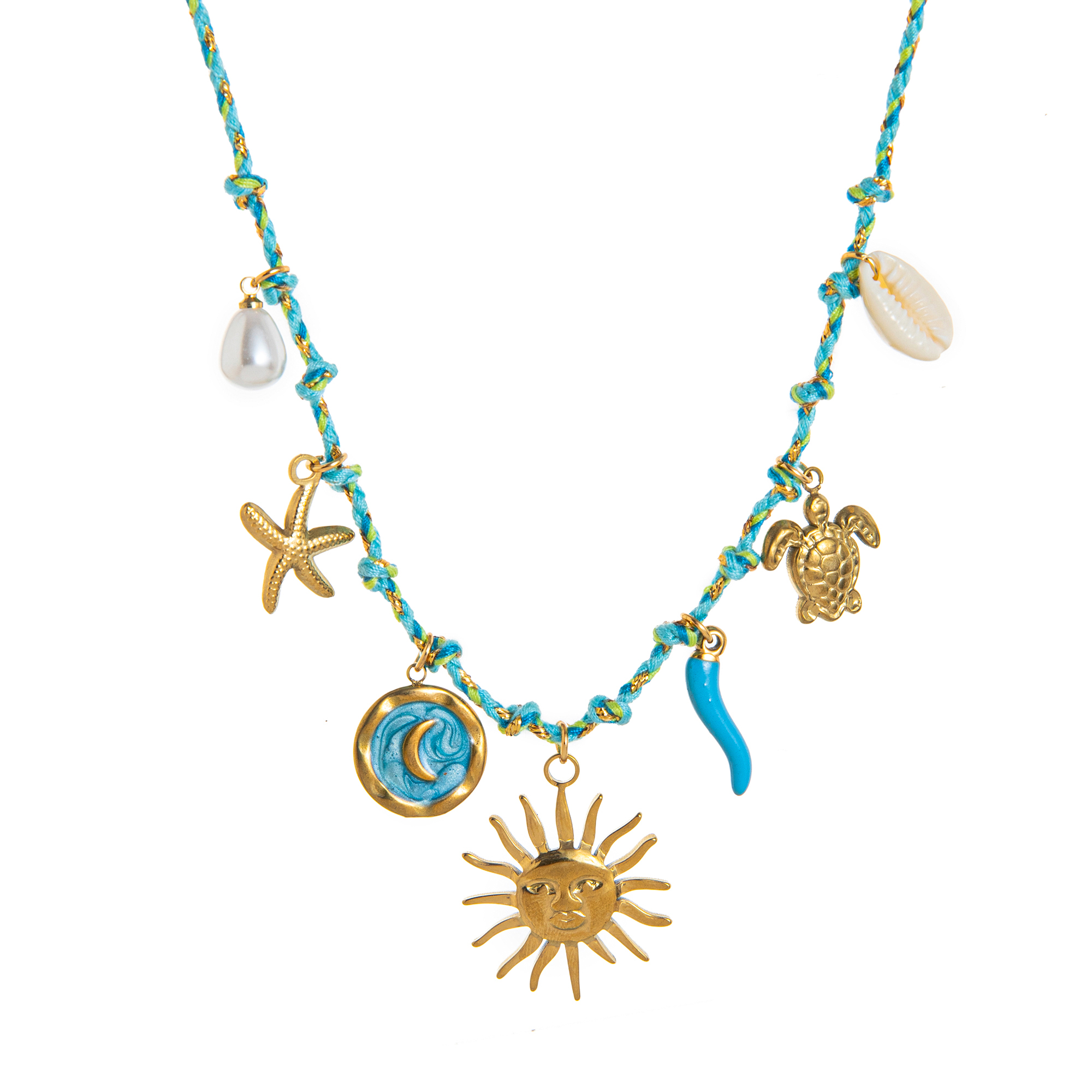 Γυναικείο Κολιέ Aegean Tales Charms από Ανοξείδωτο Ατσάλι σε Γαλάζιο Χρυσό Κορδόνι.