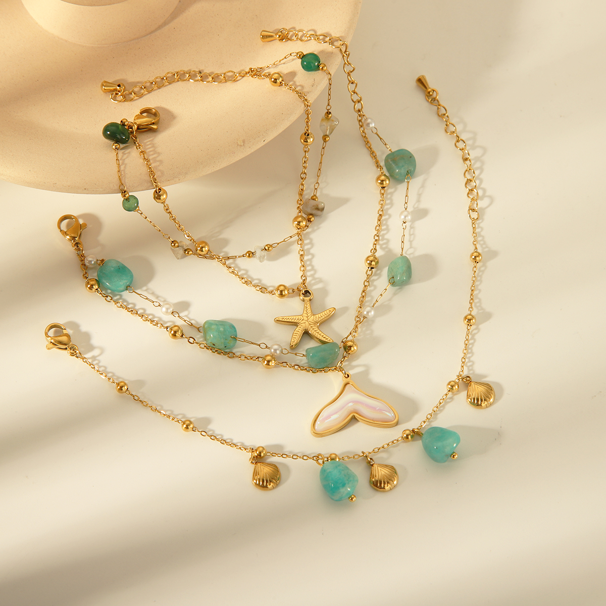 Γυναικείο βραχιόλι Fish Tail από ανοξείδωτο ατσάλι επιχρυσωμένο 18Κ με τιρκουάζ φυσικές πέτρες και πέρλες.