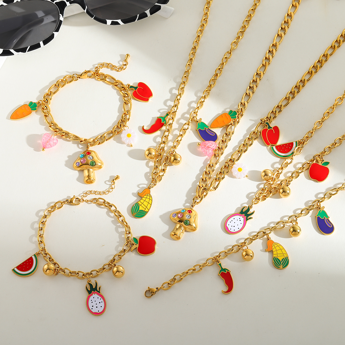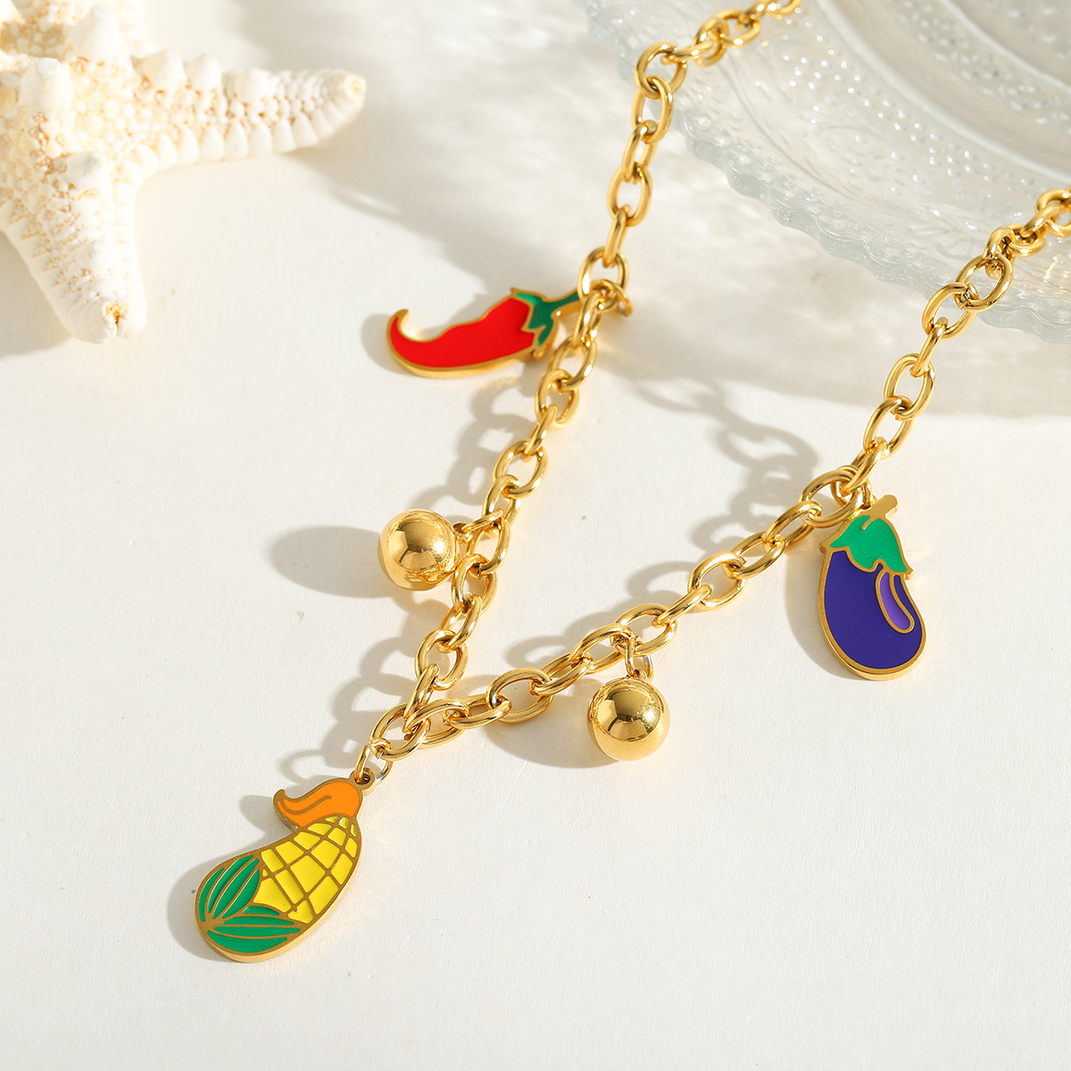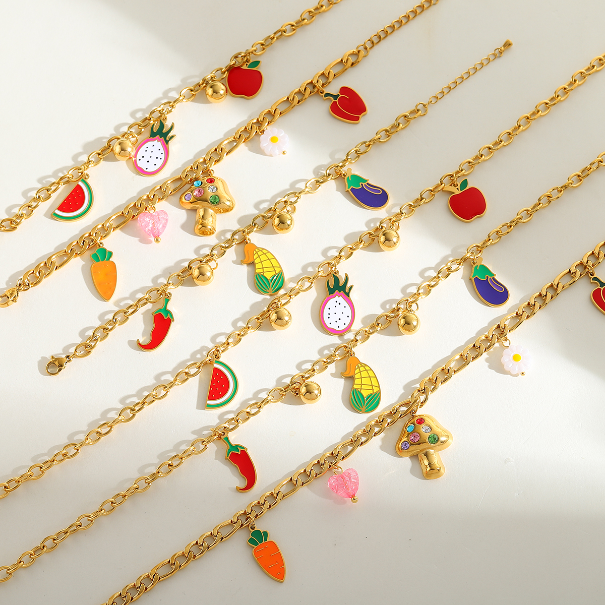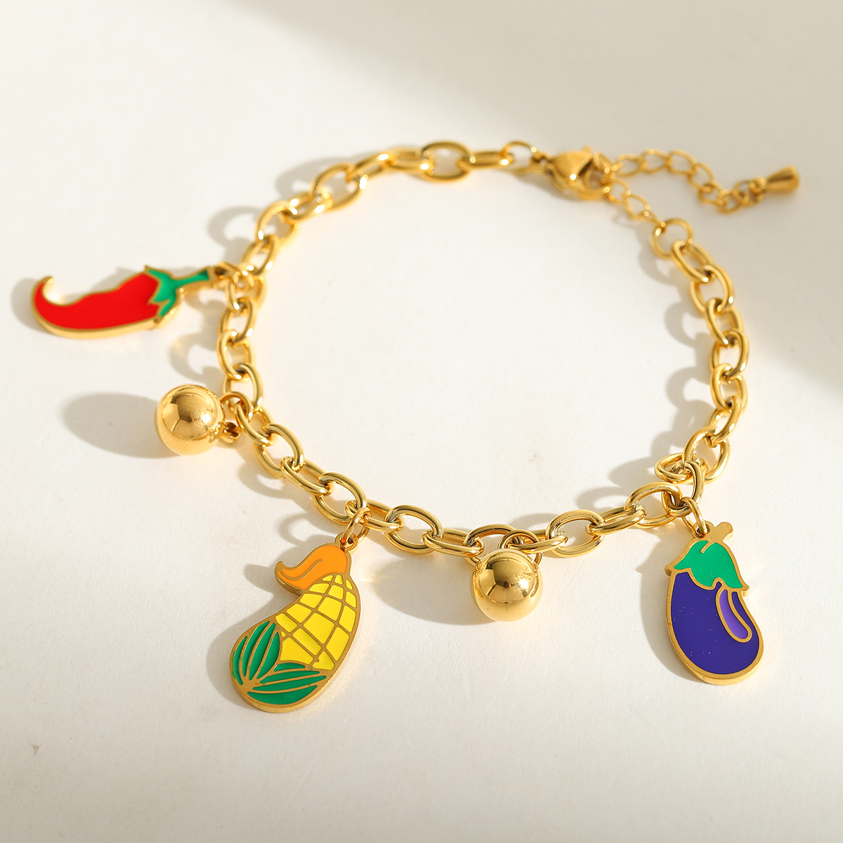 Γυναικείο βραχιόλι Multi Charms Eggplant από ανοξείδωτο ατσάλι επιχρυσωμένο 18K, πολύχρωμο βραχιόλι με μελιτζάνα και διακοσμητική πιπεριά.
