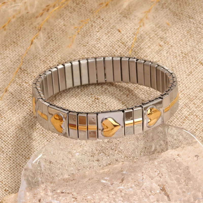 Γυναικείο Ελαστικό Βραχιόλι Heartbeats από Ανοξείδωτο Ατσάλι Χρυσό – Ασημί, με διακοσμητικές καρδίες και χρυσές λεπτομέρειες.