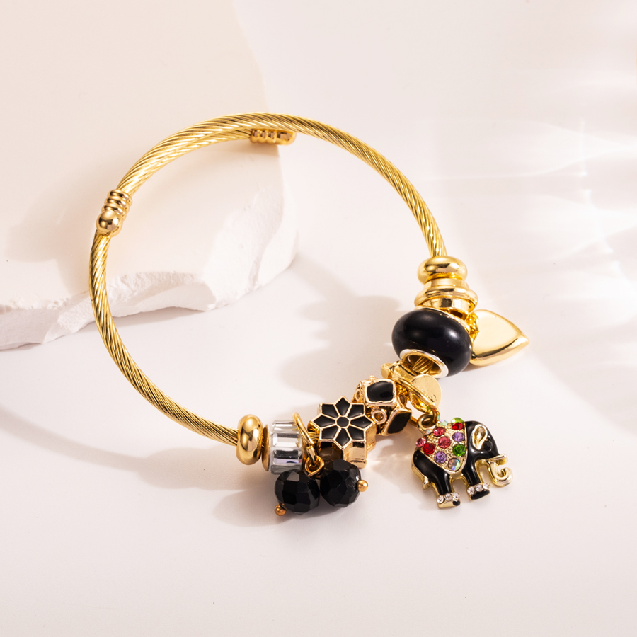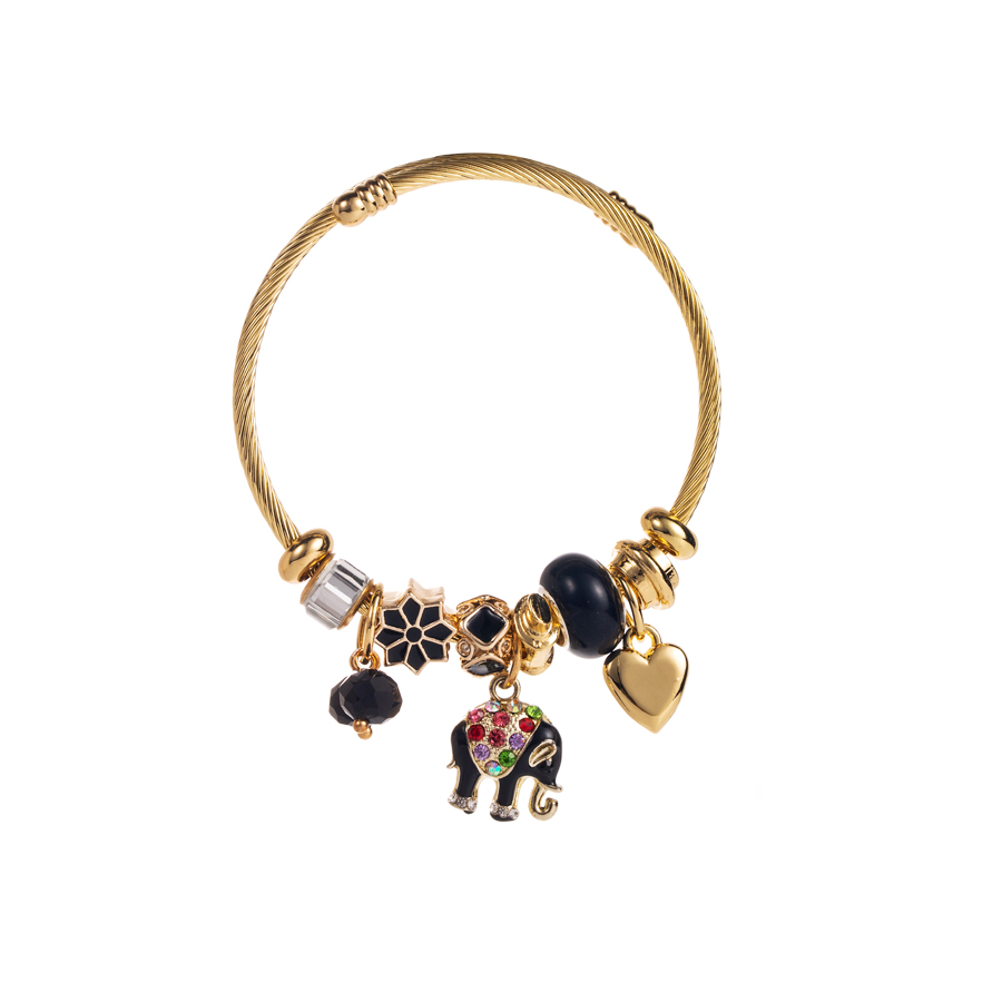 Γυναικείο βραχιόλι Elephant από ανοξείδωτο ατσάλι με μαύρες διακοσμητικές λεπτομέρειες και ελέφαντα με στρας.