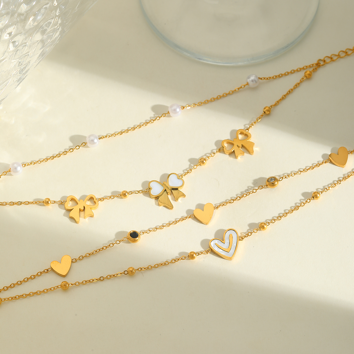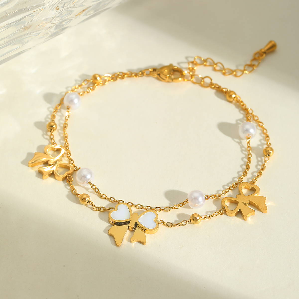 Γυναικείο βραχιόλι με διπλή αλυσίδα φιόγκος & πέρλες από ανοξείδωτο ατσάλι επιχρυσωμένο 18Κ.
