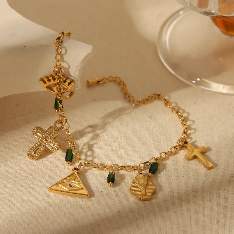 Γυναικείο βραχιόλι Green Charms Eye από ανοξείδωτο ατσάλι επιχρυσωμένο 18Κ, με πράσινα διακοσμητικά στοιχεία και charms.