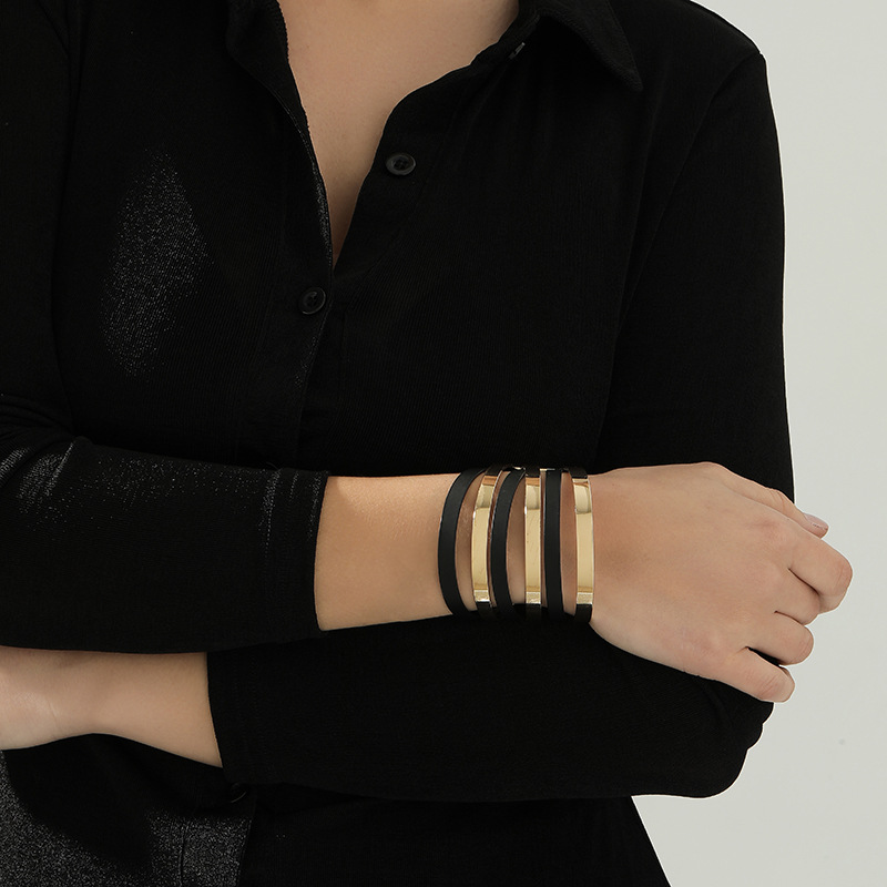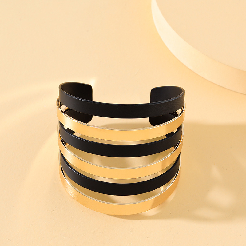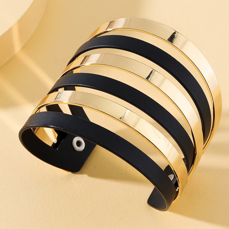 Γυναικείο μεγάλο μεταλλικό βραχιόλι σε χρυσό και μαύρο χρώμα. Statement βραχιόλι ανοιχτού τύπου.
