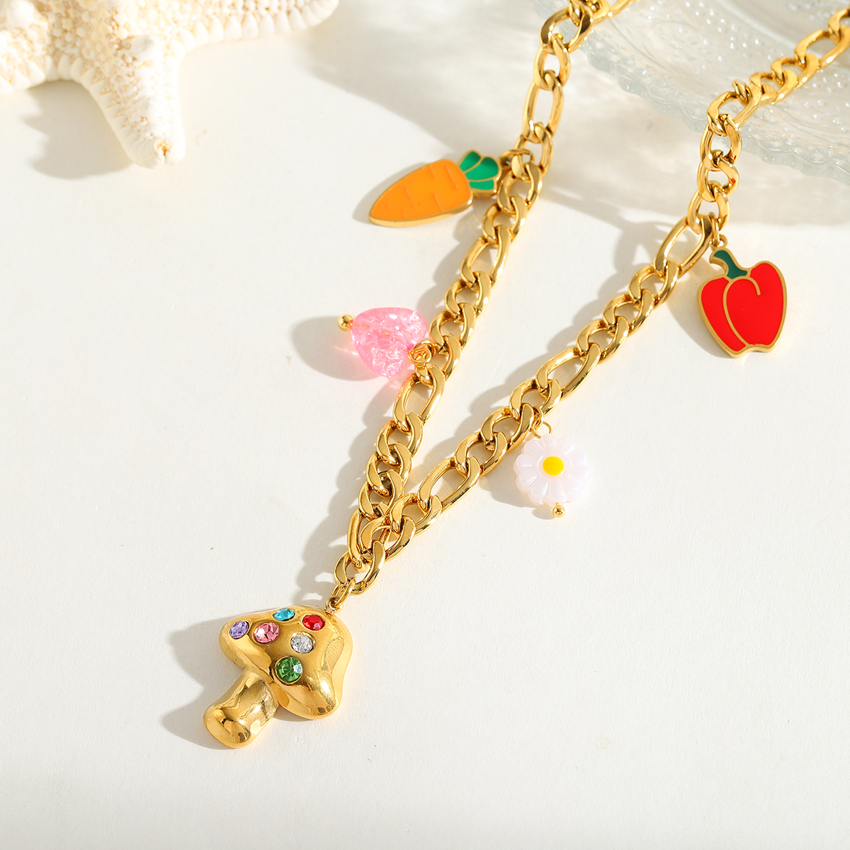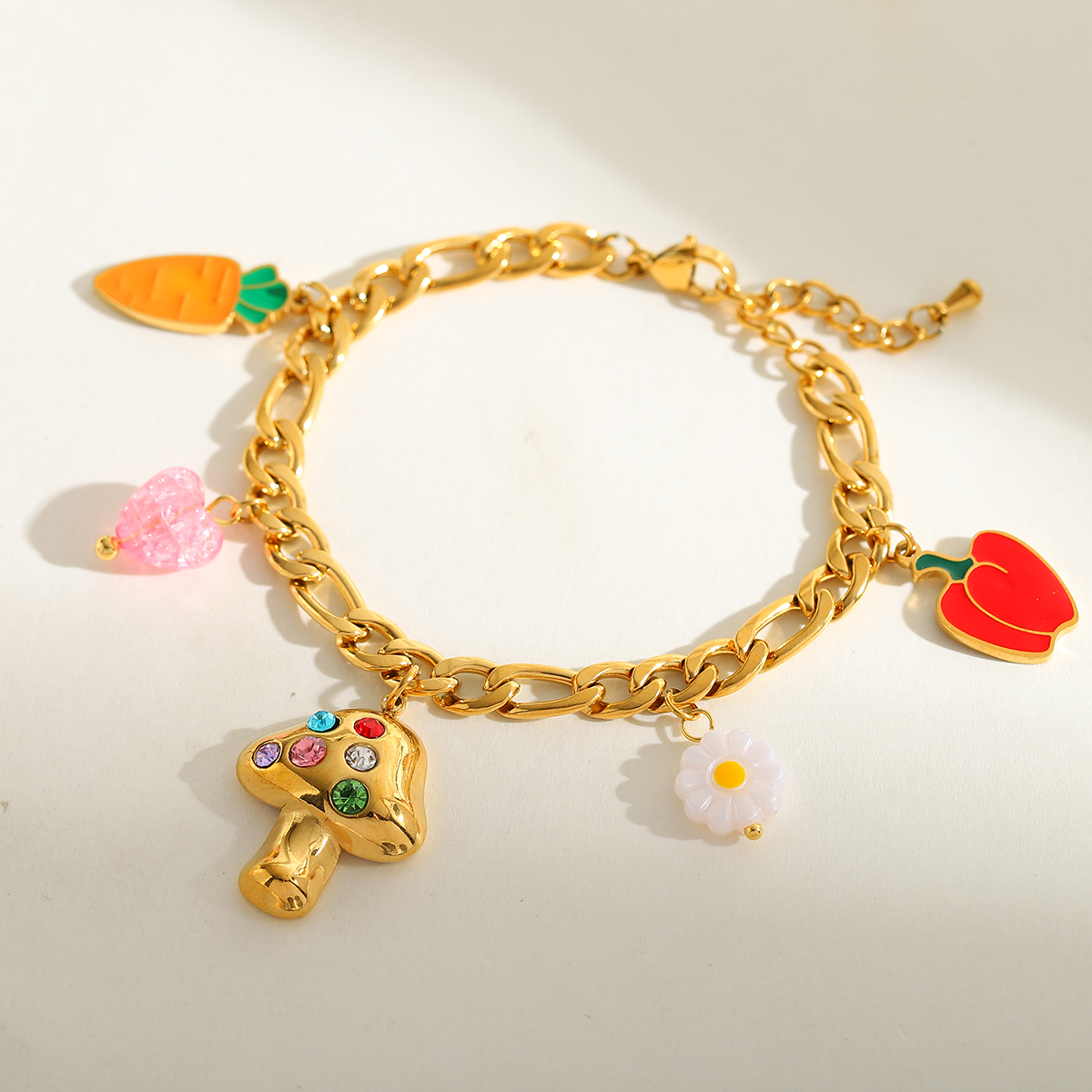 Γυναικείο βραχιόλι Multi Charms Mashroom από ανοξείδωτο ατσάλι επιχρυσωμένο 18K, μανιτάρι με zircon και διακοσμητικά στοιχεία.