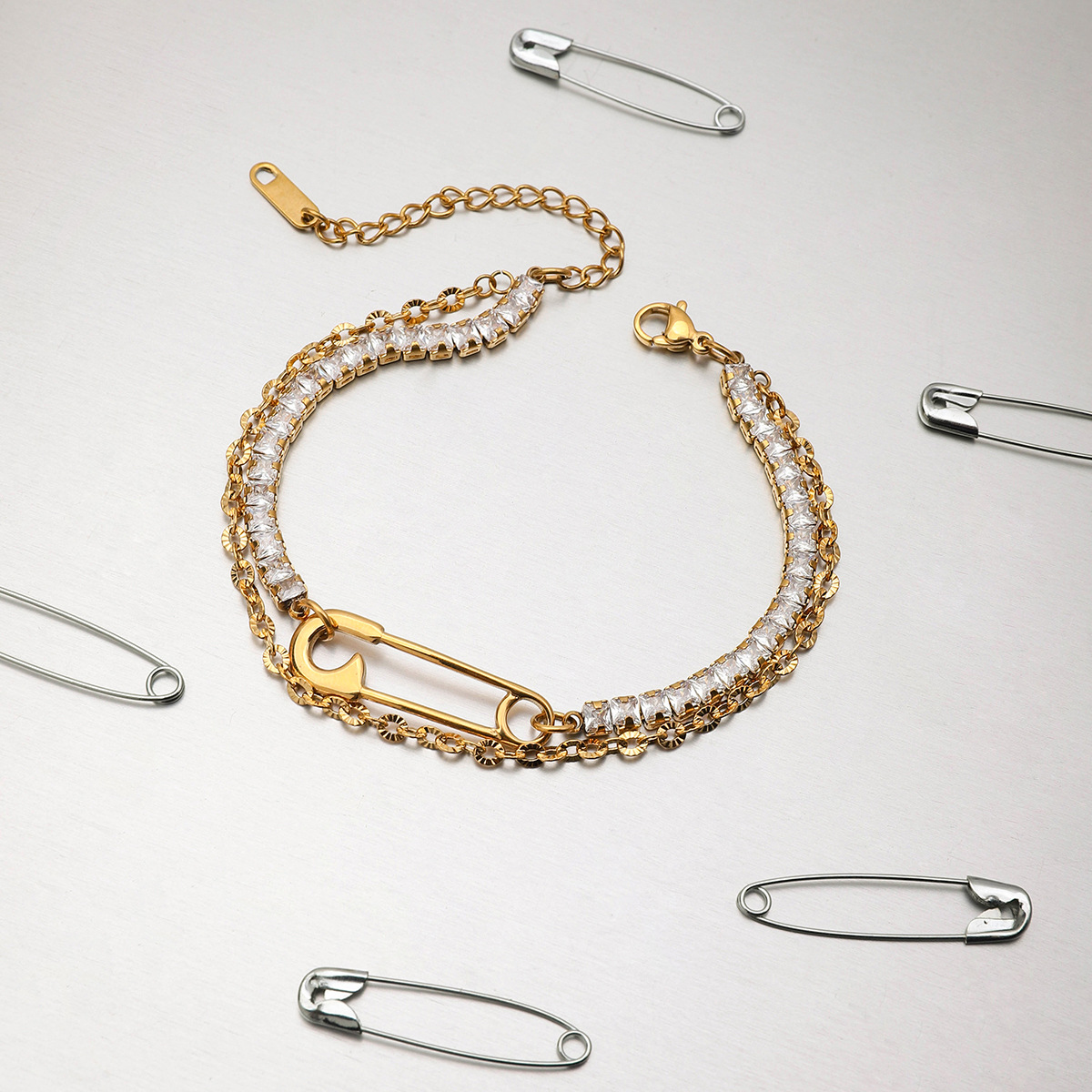 Γυναικείο Βραχιόλι Pinned Glam από Ανοξείδωτο Ατσάλι Επιχρυσωμένο 18Κ με Zircon. Βραχιόλι με διπλή χρυσή αλυσίδα, παραμάνα και Zircon.