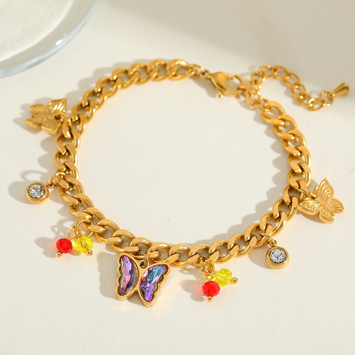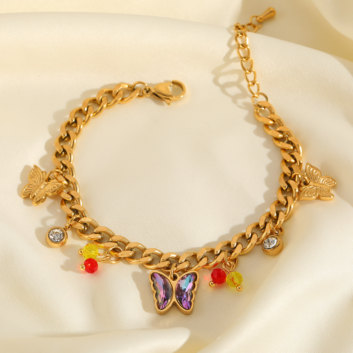 Γυναικείο βραχιόλι Purple Butterfly από ανοξείδωτο ατσάλι επιχρυσωμένο 18Κ, με Zircon και διακοσμητικά charms πεταλούδα.