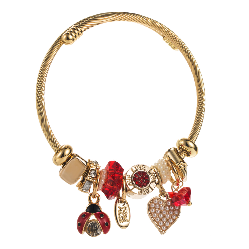 Γυναικείο βραχιόλι Red Ladybug από ανοξείδωτο ατσάλι με charms, κόκκινες διακοσμητικές λεπτομέρειες, πασχαλίτσα και καρδιά με στρας.