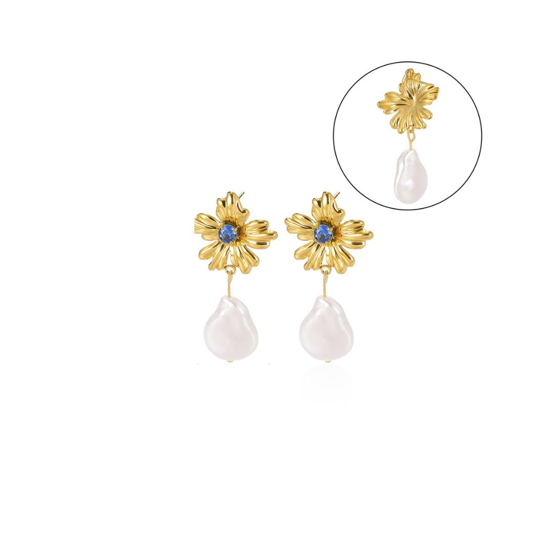 Γυναικεία σκουλαρίκια blue flower από ανοξείδωτο ατσάλι επιχρυσωμένα 18Κ με Zircon και πέρλα. Κομψά σκουλαρίκια λουλούδι, καρφωτά με μπλε zircon και κρεμαστή πέρλα.