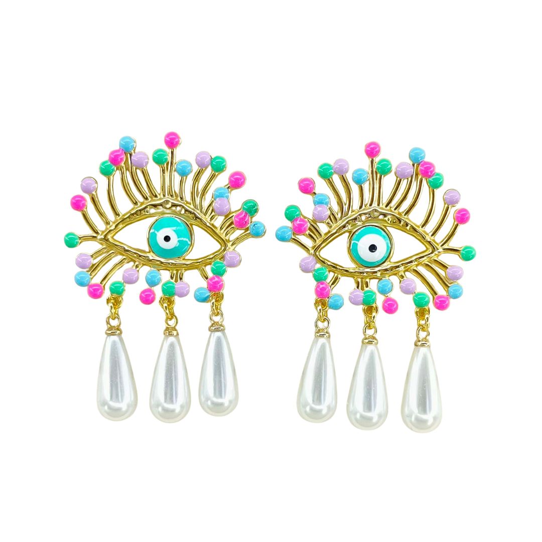 Γυναικεία σκουλαρίκια Color Pop Eye από ανοξείδωτο ατσάλι επιχρυσωμένα 18Κ με πέρλες. Ιδιαίτερα κρεμαστά σκουλαρίκια μάτι πολύχρωμα με πέρλες.