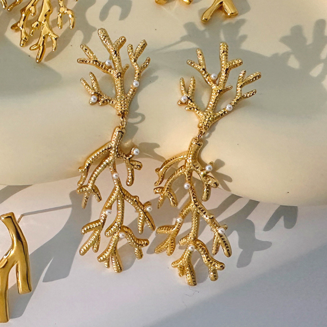 Γυναικεία σκουλαρίκια Coral από ανοξείδωτο ατσάλι επιχρυσωμένα 18K σε σχήμα κοραλλιού με μικρές πέρλες.