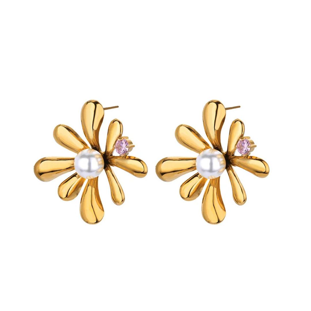 Γυναικεία σκουλαρίκια flower από ανοξείδωτο ατσάλι επιχρυσωμένα 18Κ με Zircon και πέρλα. Κομψά σκουλαρίκια λουλούδι, καρφωτά με ροζ zircon και κρεμαστή πέρλα.