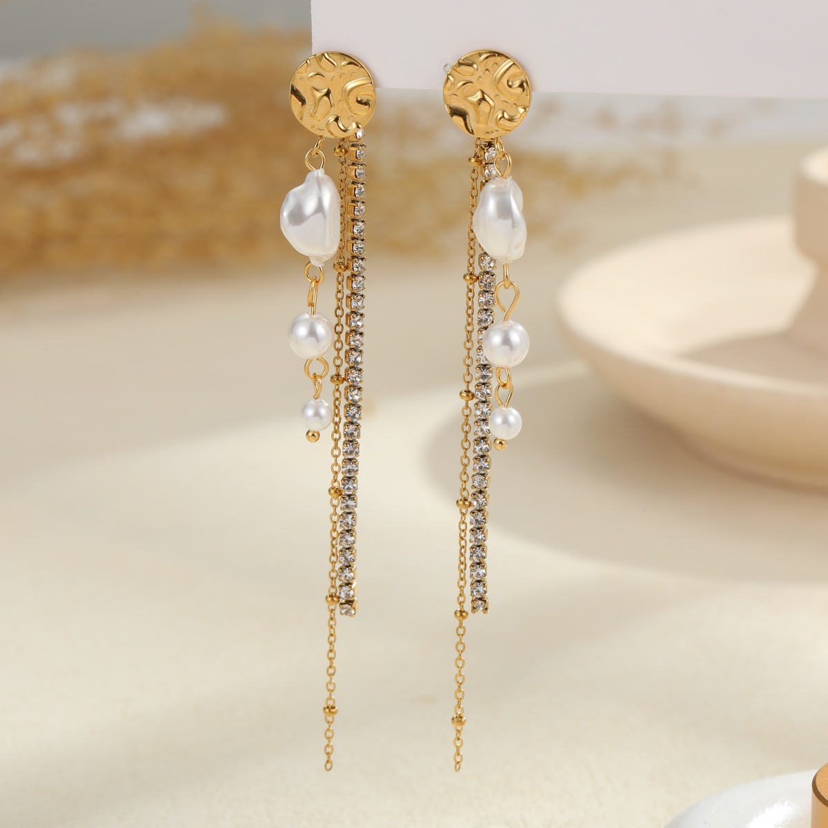 Γυναικεία σκουλαρίκια Pearl & Zircon από ανοξείδωτο ατσάλι επιχρυσωμένα 18Κ με πέρλες. Μακριά κρεμαστά σκουλαρίκια με αλυσίδα, zircon και πέρλες.