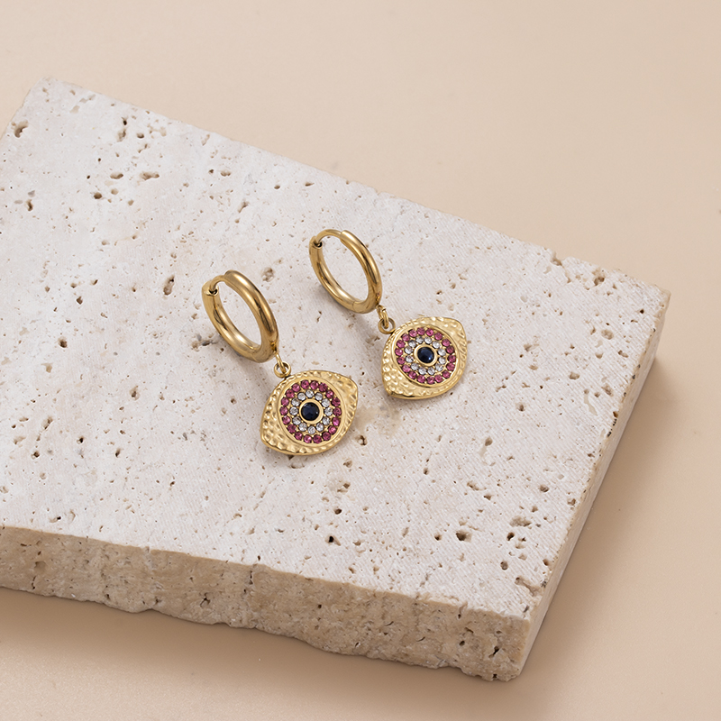 Γυναικεία σκουλαρίκια κρίκοι Pink Eye από ανοξείδωτο ατσάλι επιχρυσωμένα 18Κ με Zircon.