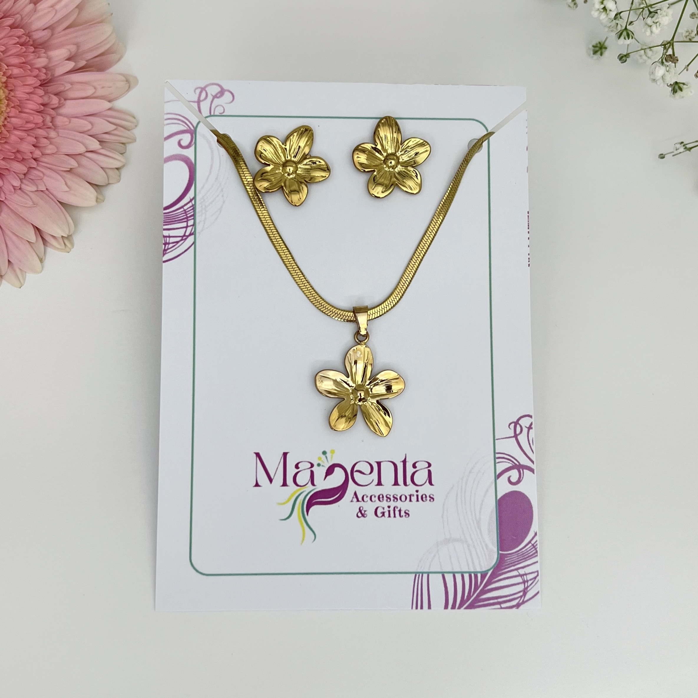 Το σετ περιλαμβάνει κολιέ και σκουλαρίκια. Ανθεκτικά, υποαλλεργικά και ιδανικά για καθημερινή χρήση.