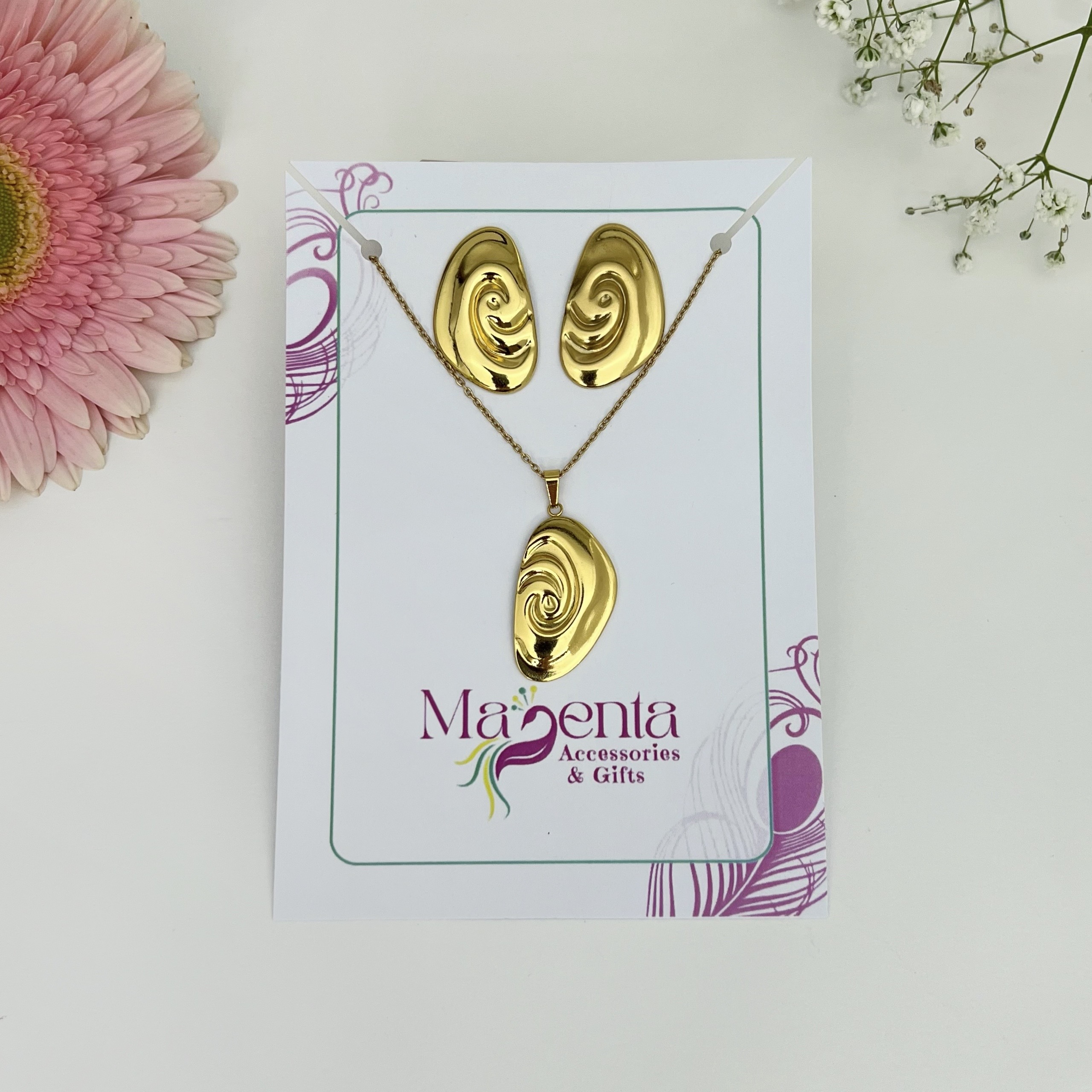 Το σετ περιλαμβάνει κολιέ και σκουλαρίκια. Ανθεκτικά, υποαλλεργικά και ιδανικά για καθημερινή χρήση.
