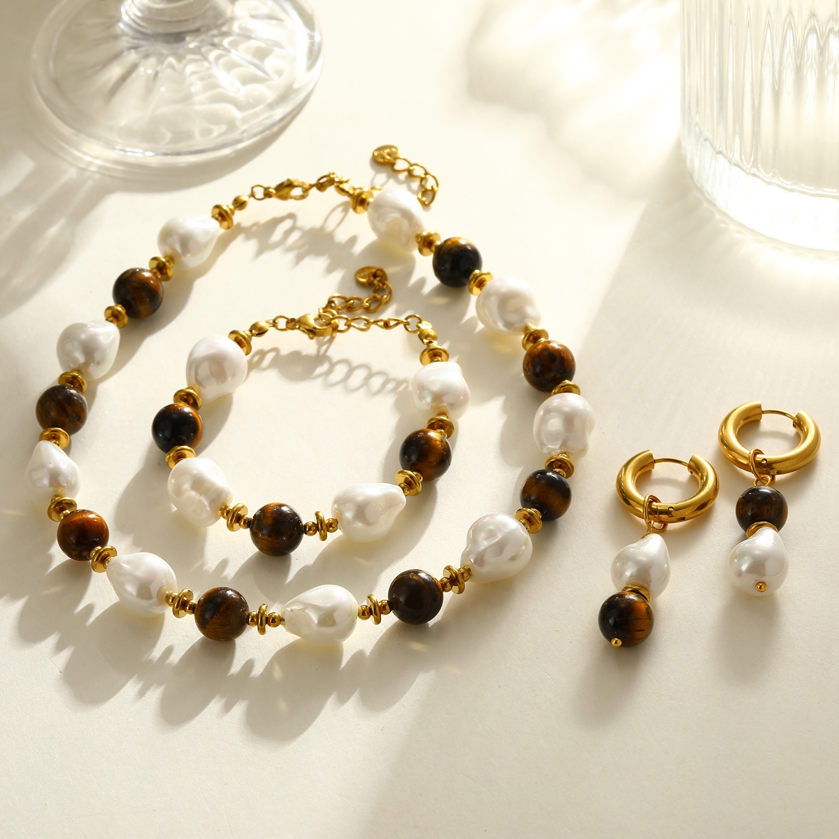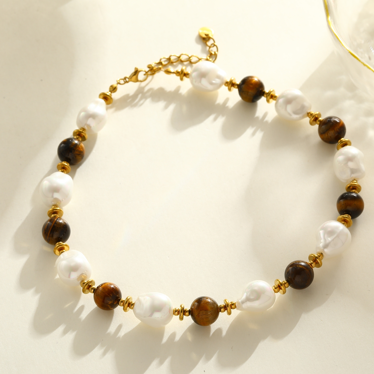 Γυναικείο Κολιέ Gaia Tiger Stone & Pearl Collection από Ανοξείδωτο Ατσάλι με φυσικές πέτρες. Ένα statement κολιέ που ενώνει τη μυστηριώδη λάμψη του φυσικού Tiger Eye με την κλασική κομψότητα των Shell Pearls.