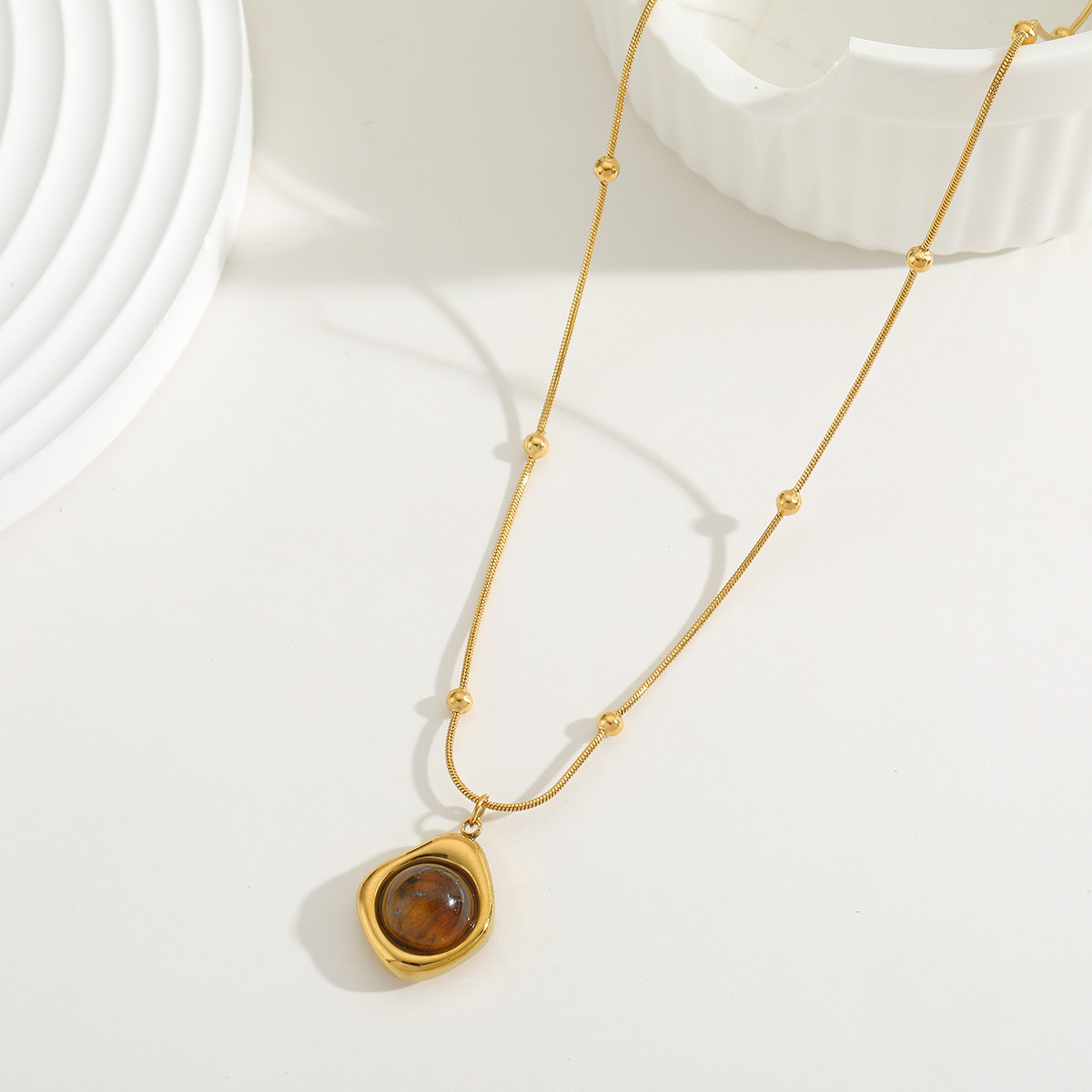 Γυναικείο κολιέ Tiger Eye από Ανοξείδωτο Ατσάλι επιχρυσωμένο 18K. Kολιέ μενταγιόν με λεπτή ball chain αλυσίδα και καφέ πέτρα.