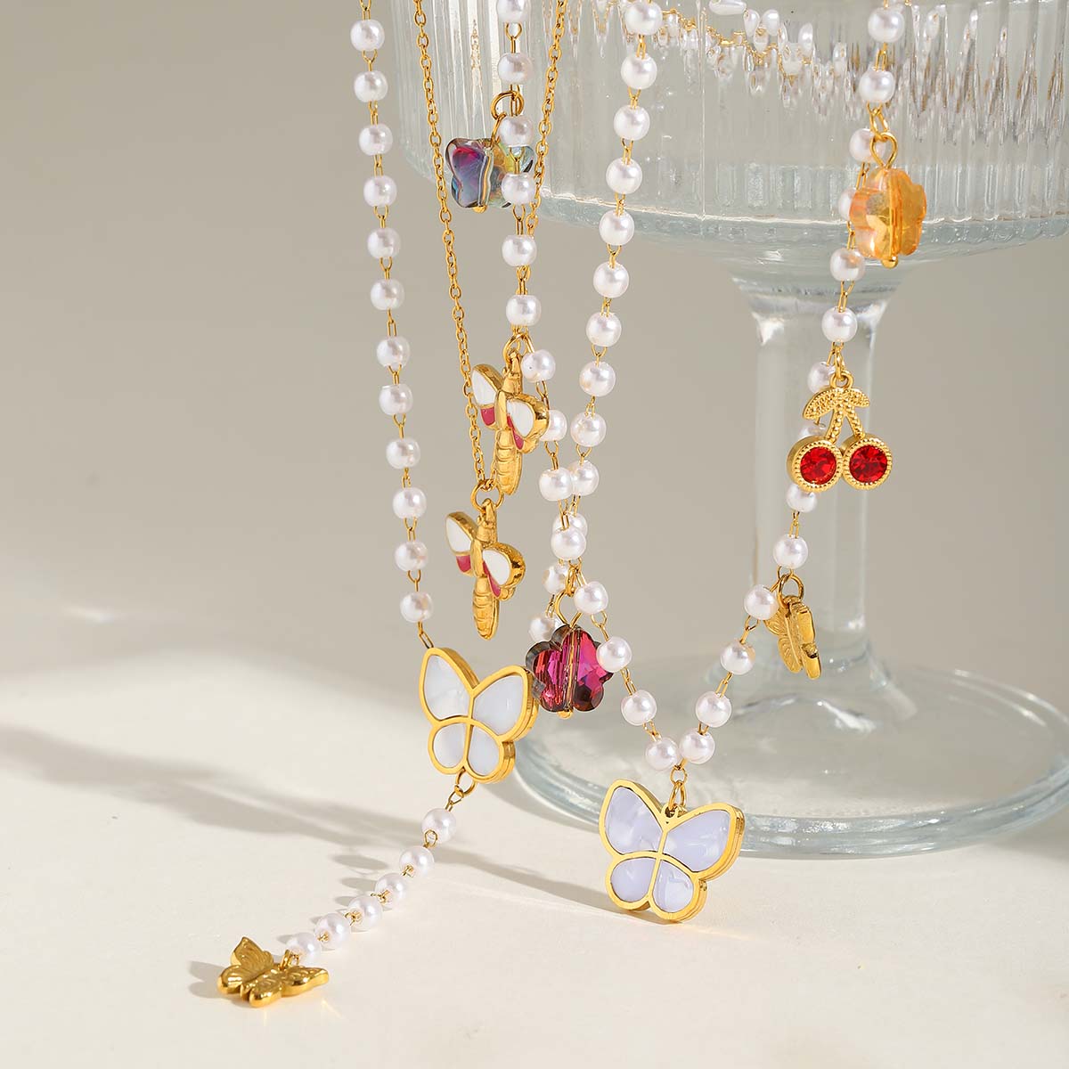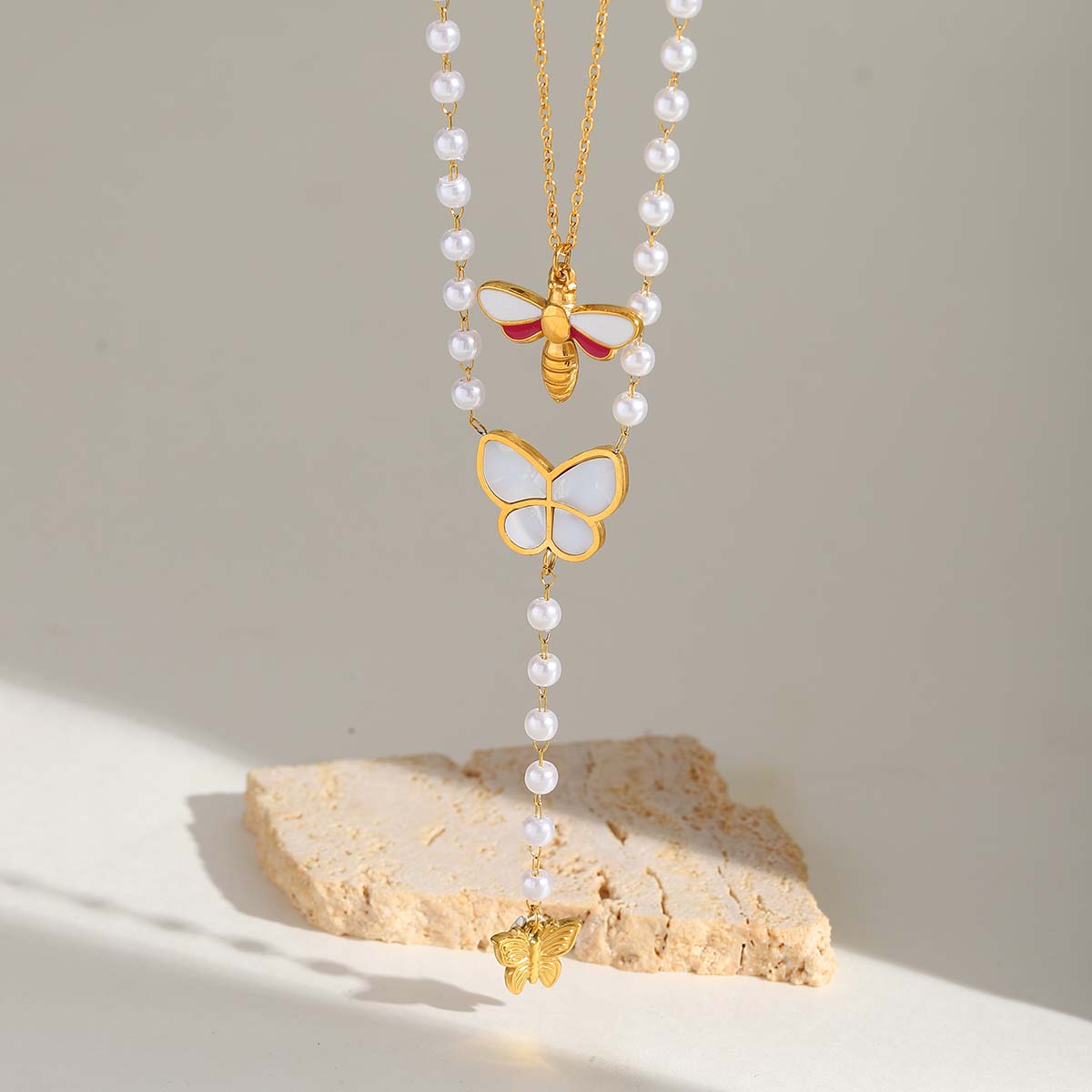 Γυναικείο κολιέ White Butterfly από ανοξείδωτο ατσάλι επιχρυσωμένο 18K με πέρλες, κολιέ με διπλή αλυσίδα πεταλούδες.
