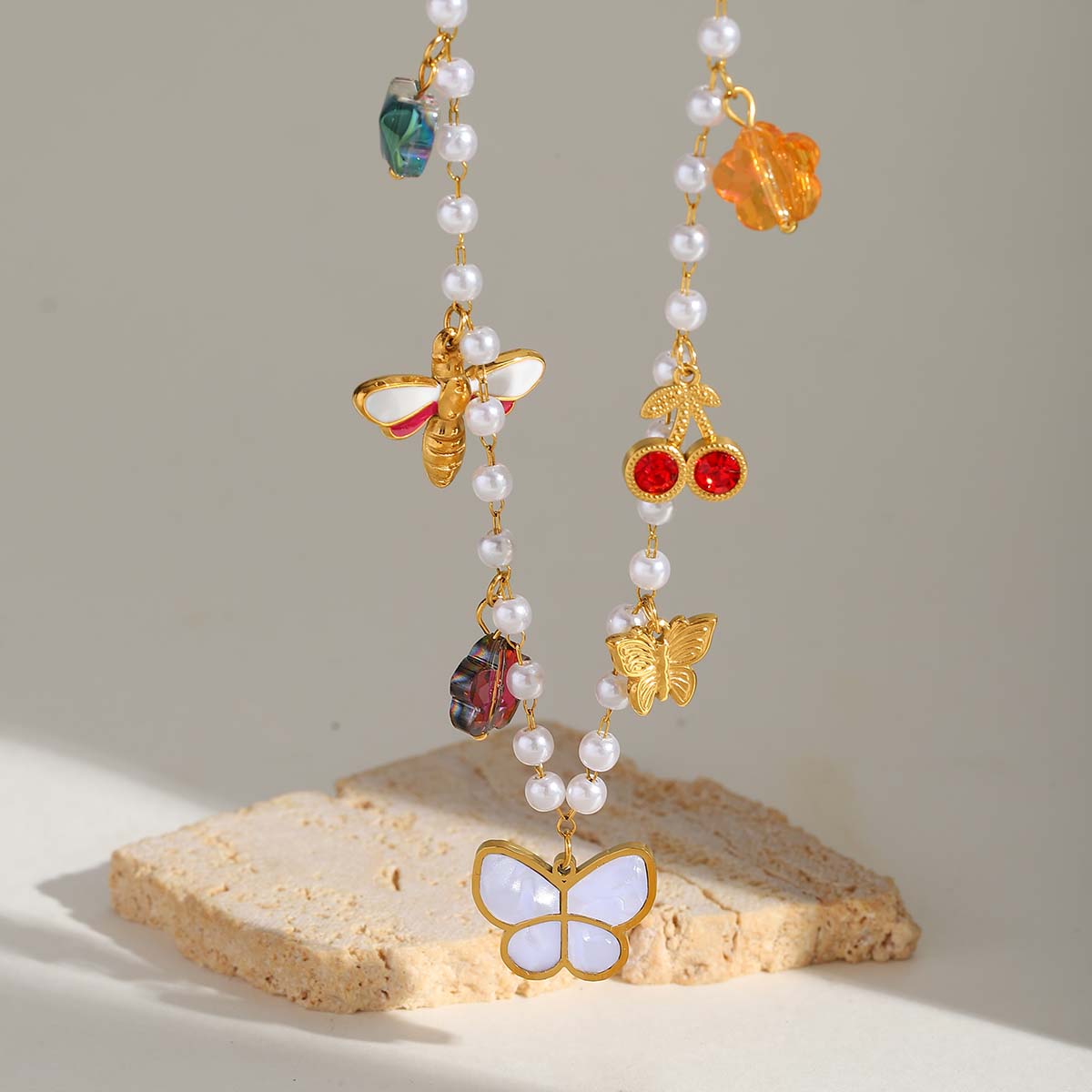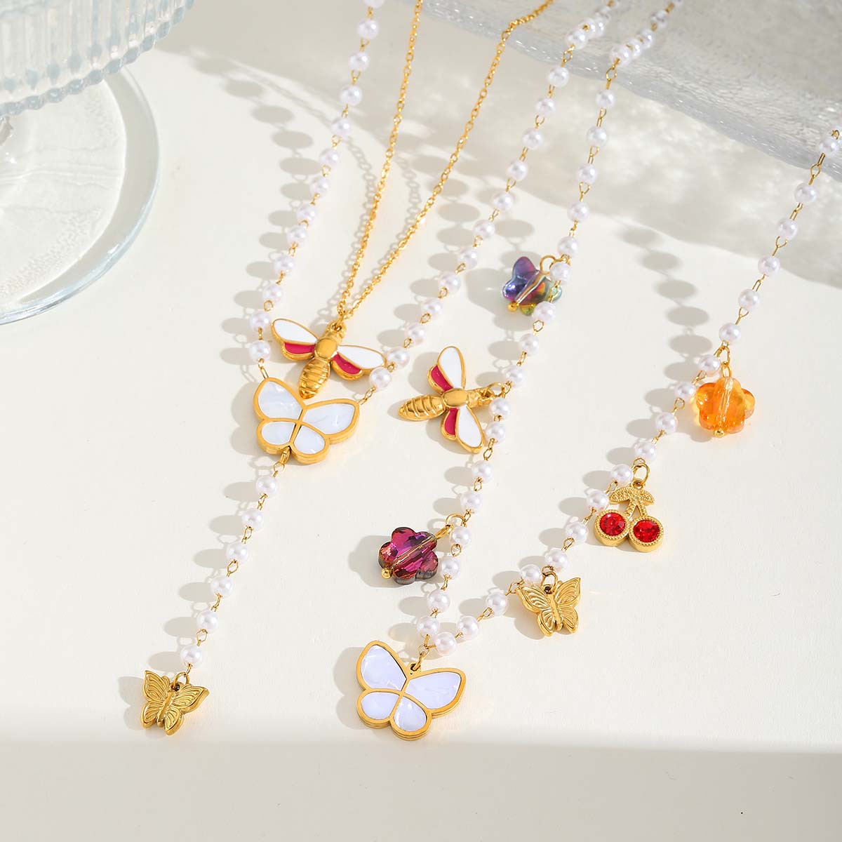 Γυναικείο κολιέ White Butterfly από ανοξείδωτο ατσάλι επιχρυσωμένο 18K με πέρλες, κολιέ με πεταλούδες και διακοσμητικά charms.