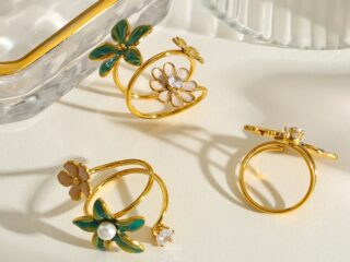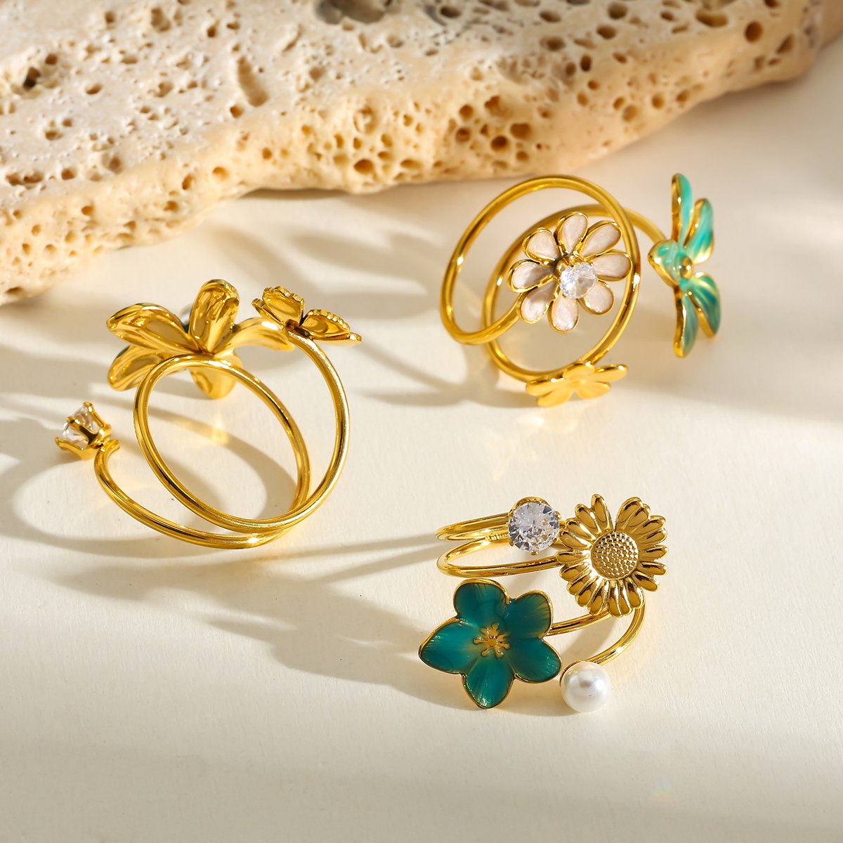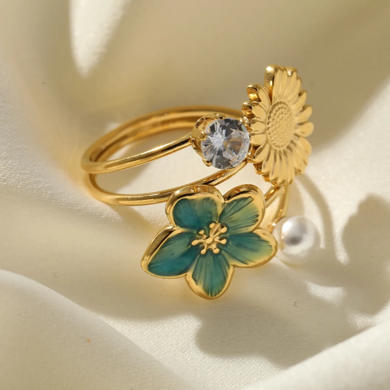 Γυναικείο δαχτυλίδι Blooming Charm από ανοξείδωτο ατσάλι επιχρυσωμένο 18Κ με διακοσμητικά λουλούδια, σε πράσινη και χρυσή απόχρωση.
