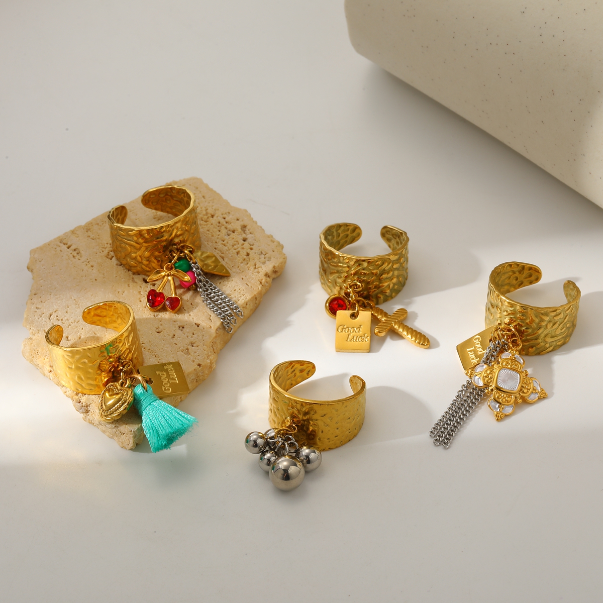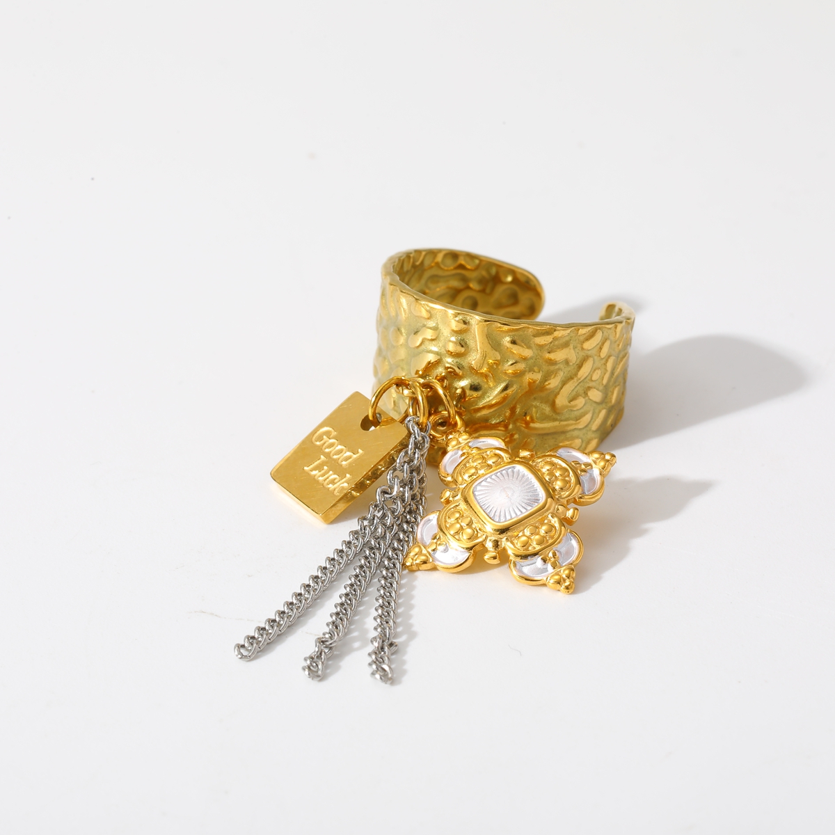 Γυναικείο δαχτυλίδι Charm Rock Ring από ανοξείδωτο ατσάλι επιχρυσωμένο 18Κ, με σταυρό και διακοσμητικές ασημί αλυσίδες, προσαρμόσιμο .