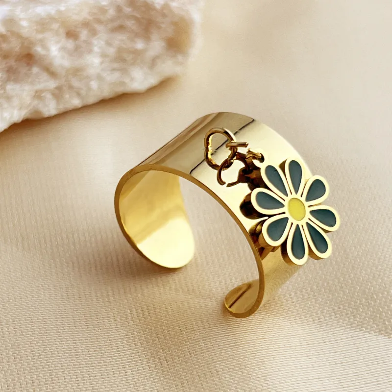 Γυναικείο δαχτυλίδι Colorful Flower από ανοξείδωτο ατσάλι ανοιχτού τύπου με διακοσμητικά λουλούδια σε διάφορα χρώματα.