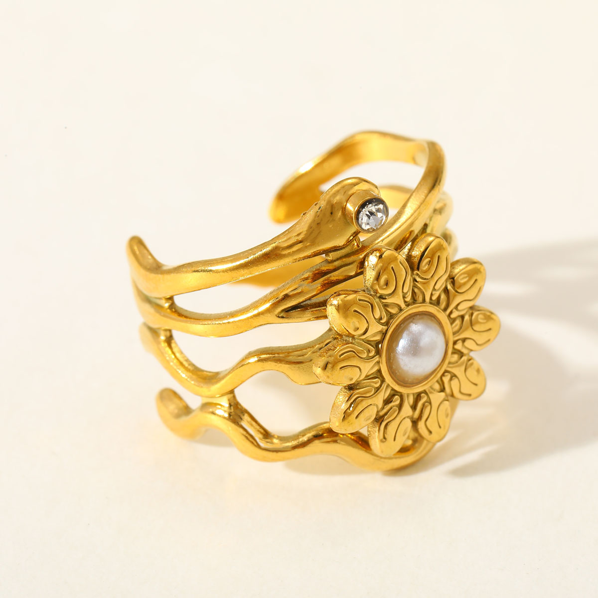Γυναικείο δαχτυλίδι Gold Flower από ανοξείδωτο ατσάλι επιχρυσωμένο 18Κ ανοιχτού τύπου ,σχέδιο ρευστές γραμμές και λουλούδι με πέρλα, προσαρμόσιμο .