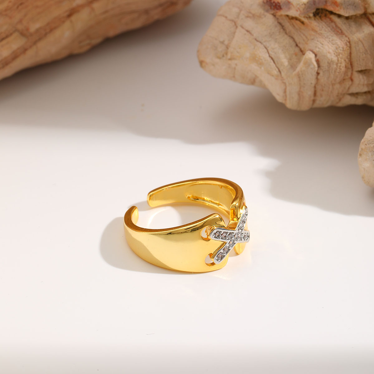 Γυναικείο δαχτυλίδι σε σχήμα X Επιχρυσωμένο 18Κ με Zircon ανοιχτού τύπου, προσαρμόσιμο.