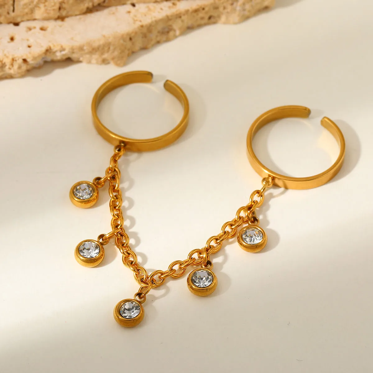 Εντυπωσιακό γυναικείο δαχτυλίδι από ανοξείδωτο ατσάλι, με διπλό κρίκο ενωμένο με αλυσίδα και λαμπερά στρας που χαρίζουν κίνηση και φως σε κάθε σου εμφάνιση. Ένα μοντέρνο statement κομμάτι που συνδυάζει δυναμισμό και κομψότητα.